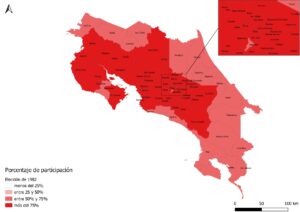 Mapa: Costa Rica: porcentaje de participación en distritos electorales. Elección 2022