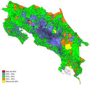 El otro corredor de participación, en color verde, abarca comunidades en la periferia de la GAM. Son los más numerosos y en ellos el porcentaje de personas que va a votar se ubica entre el 40% y el 60%.