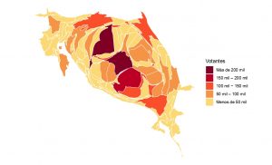 Este cartograma ayuda a visualizar estas diferencias territoriales. Como se aprecia, los cantones con más votantes se ubican en el Valle Central (en color rojo oscuro). Los municipios de San José, Alajuela y Desamparados son las localidades con más votantes en el país. Por otro lado, en las costas y zonas fronterizas aparecen las localidades con menos votantes (en color amarillo).
