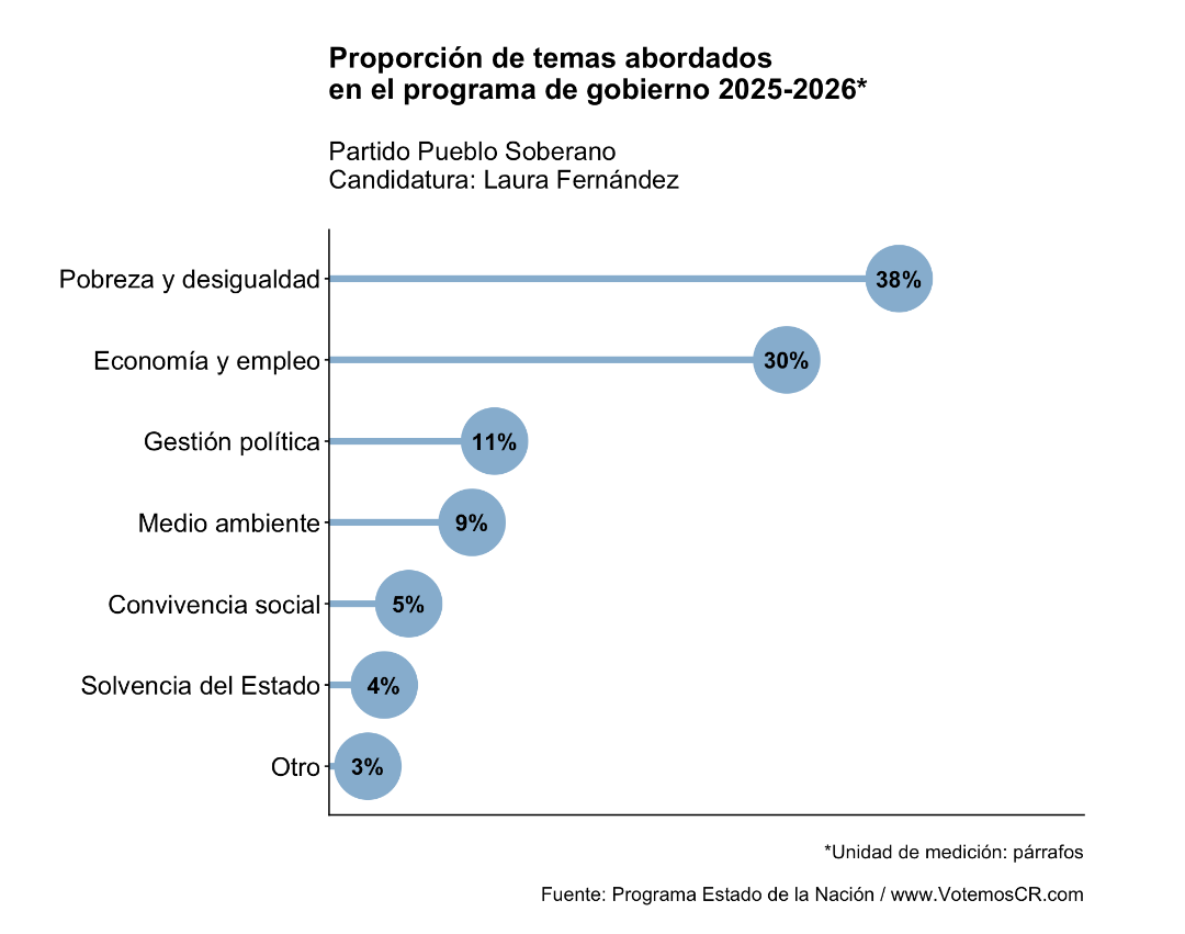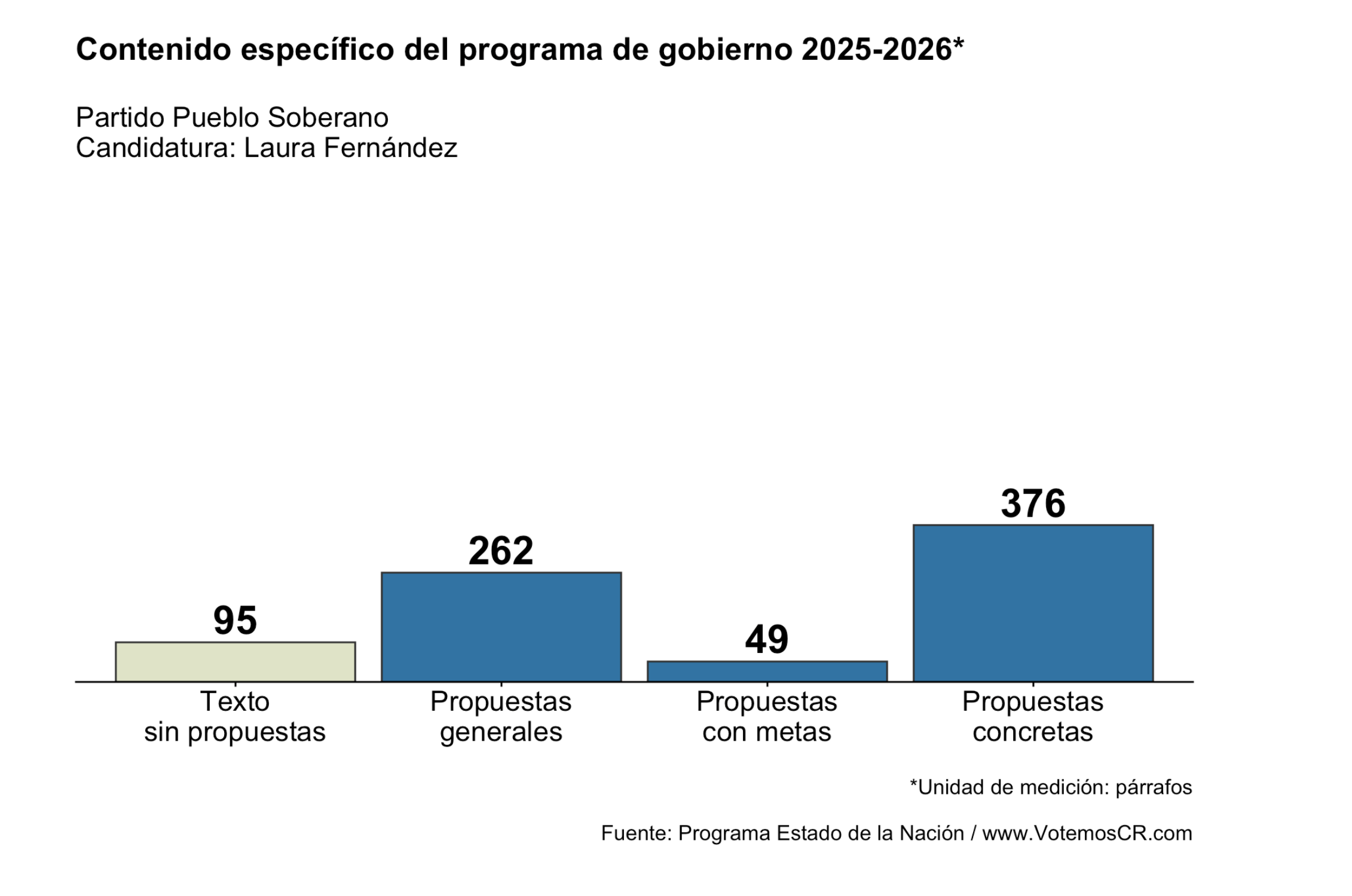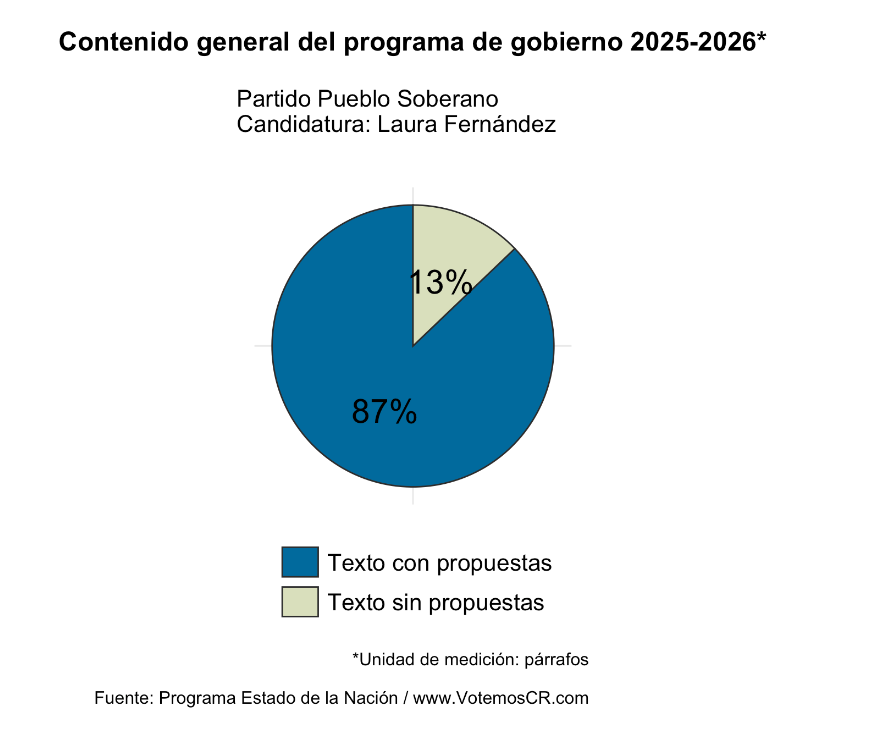 El programa de gobierno de Pueblo Soberano fue revisado completo por el PEN. Al analizar todos sus párrafos, se observa que el 87% contiene propuestas, es decir, ideas sobre qué haría el partido si llega al gobierno. El 13% restante no son propuestas, sino textos que explican el contexto, presentan diagnósticos o justifican esas ideas.