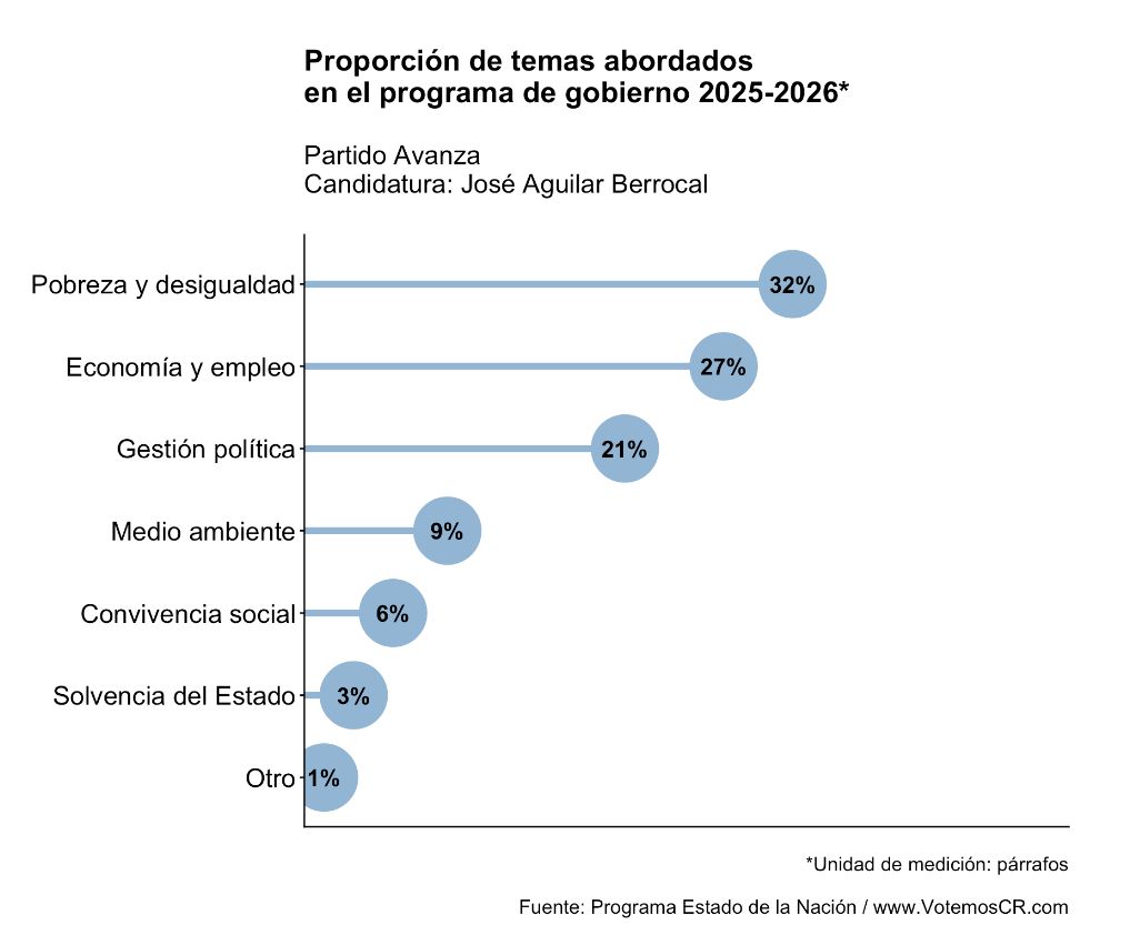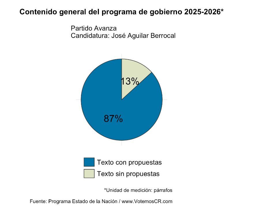 El programa de gobierno del Partido Avanza fue revisado completo por el PEN. Al analizar todos sus párrafos, se observa que el 87% contiene propuestas, es decir, ideas sobre qué haría el partido si llega al gobierno. El 13% restante no son propuestas, sino textos que explican el contexto, presentan diagnósticos o justifican esas ideas.