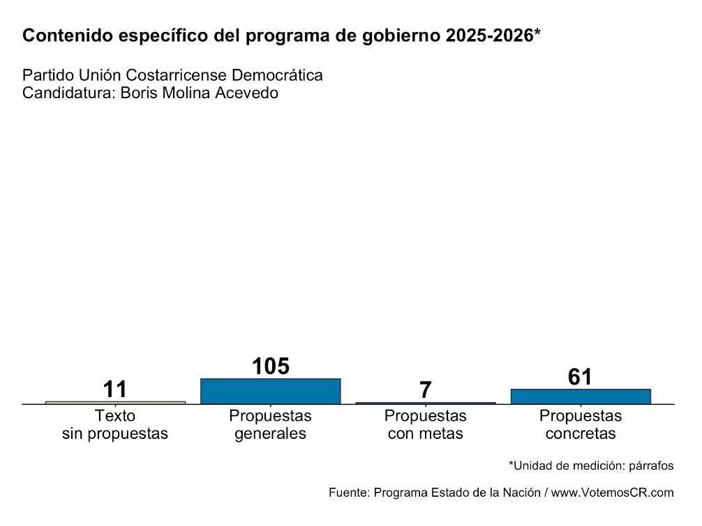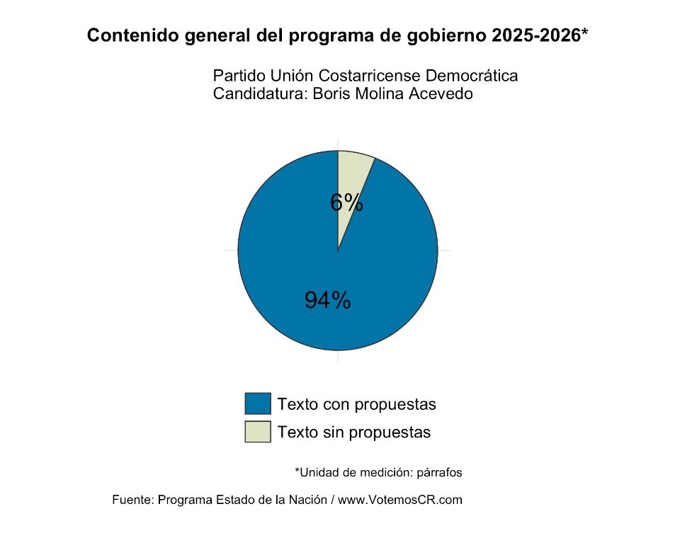 El programa de gobierno del Unión Costarricense Democrática (PUCD) fue revisado completo por el PEN. Al analizar todos sus párrafos, se observa que el 94% contiene propuestas, es decir, ideas sobre qué haría el partido si llega al gobierno. El 6% restante no son propuestas, sino textos que explican el contexto, presentan diagnósticos o justifican esas ideas.